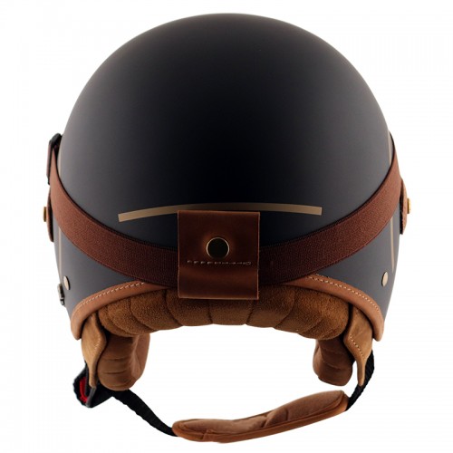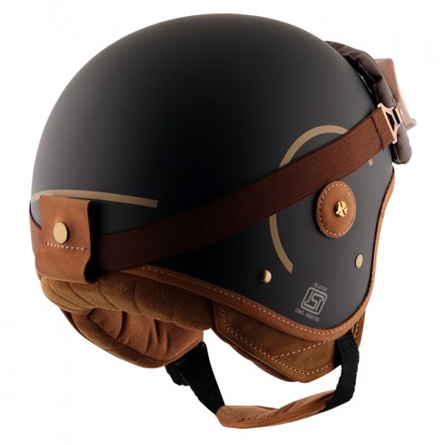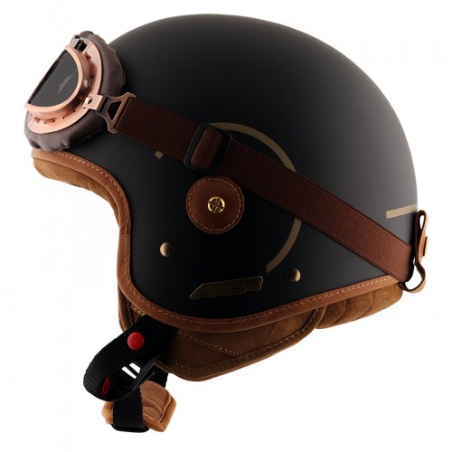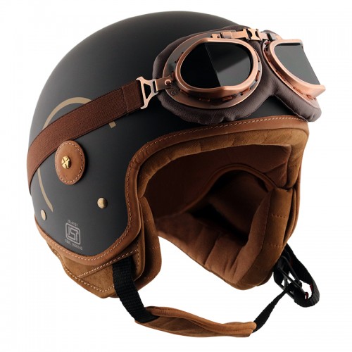 Che – A black helmet with a brown leather border and a pair of classy metallic copper goggles known as Ruin (copper-colored frame with dark shades).