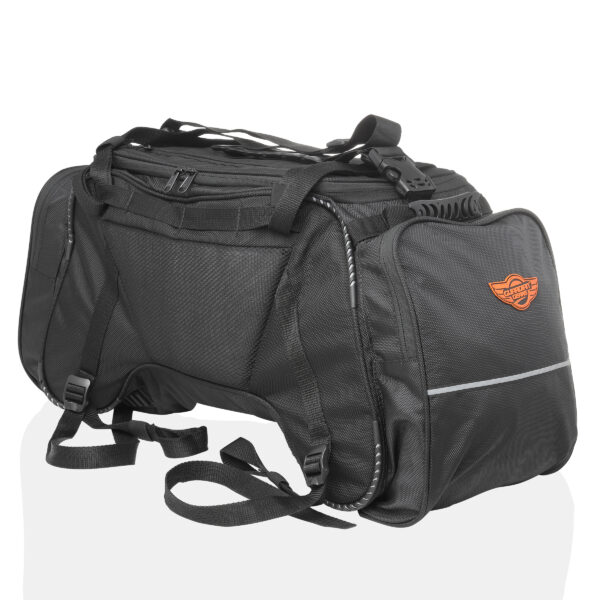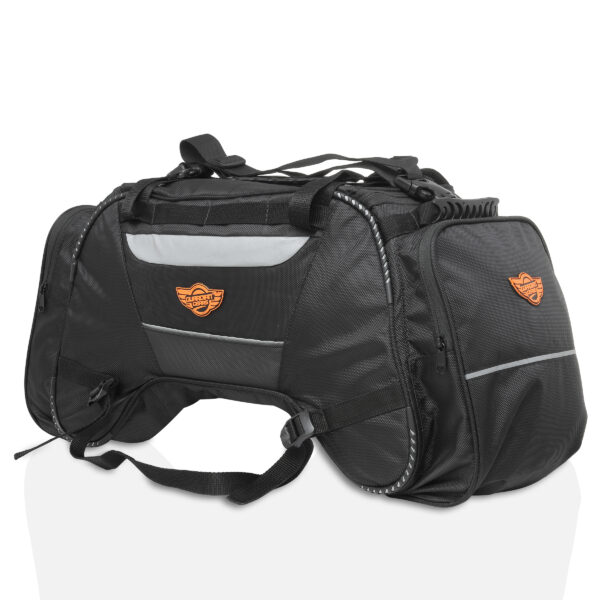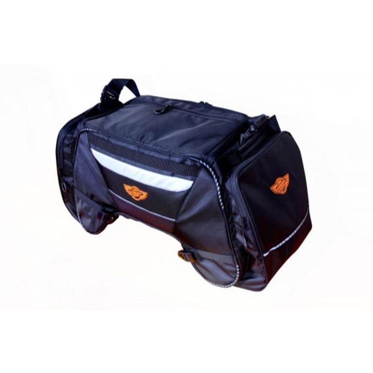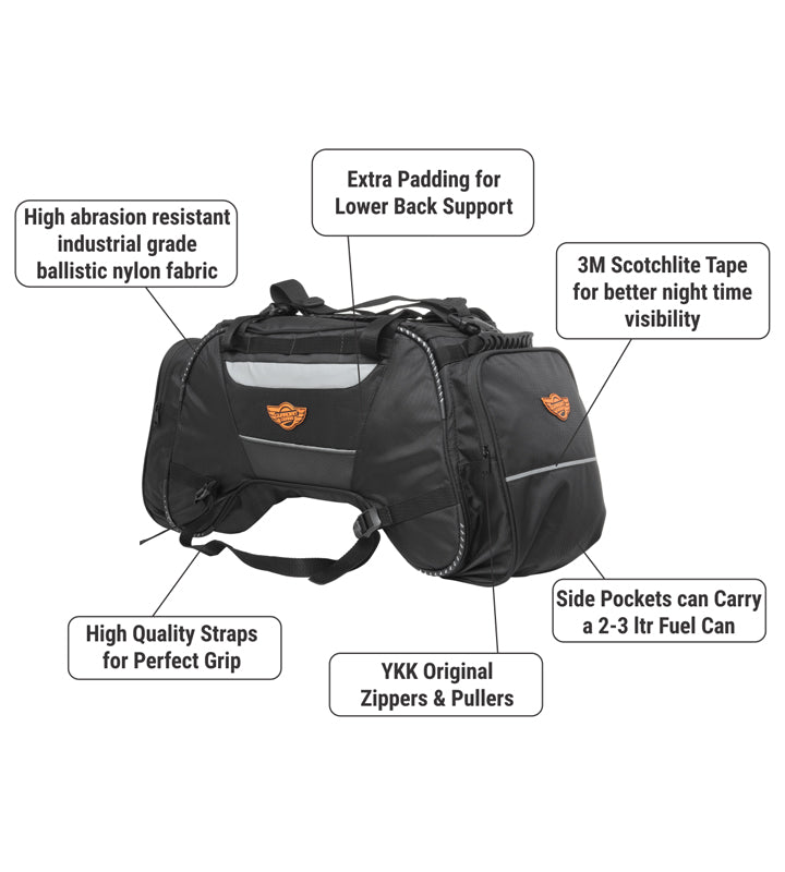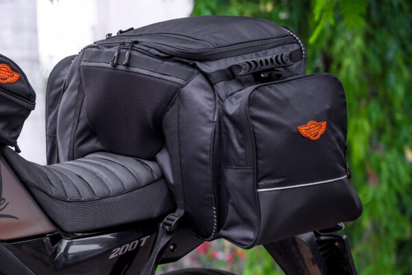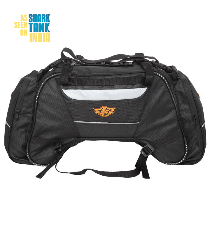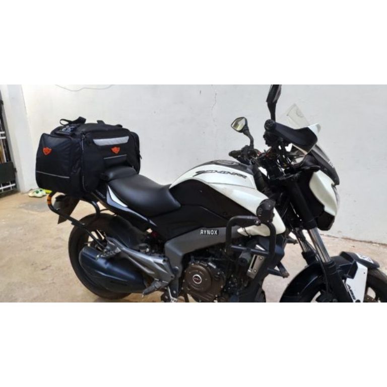 Rhino Mini Tail Bag comes with a capacity of 50 Ltrs and can carry all your stuff for a 10-15 days ride. Proudly Made in India with 1680D ballistic nylon high abrasion resistant fabric for longer durability and strength. Fits on any motorcycle on the pillion seat and also on the Top Rack. For mounting on the Top Rack, bungee cords maybe required for more stability, however if mounting on the pillion seat the straps given are sufficient. Two Side pockets and one Flap pocket for storing quick access items on the outside and one mesh pocket inside for toiletries and other stuff. Additional straps are provided for keeping any small bag on top of the Tail Bag. High visibility fabric used inside the bag for easy of access of items. Highly reflective 3M Scothlite tape for better safety and high visibility during night rides. One year warranty for any manufacturing defect.