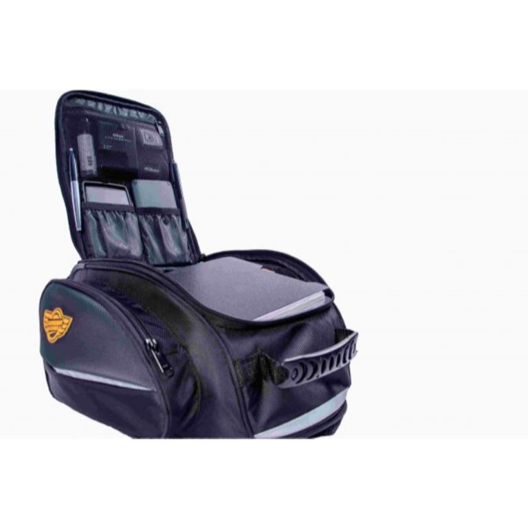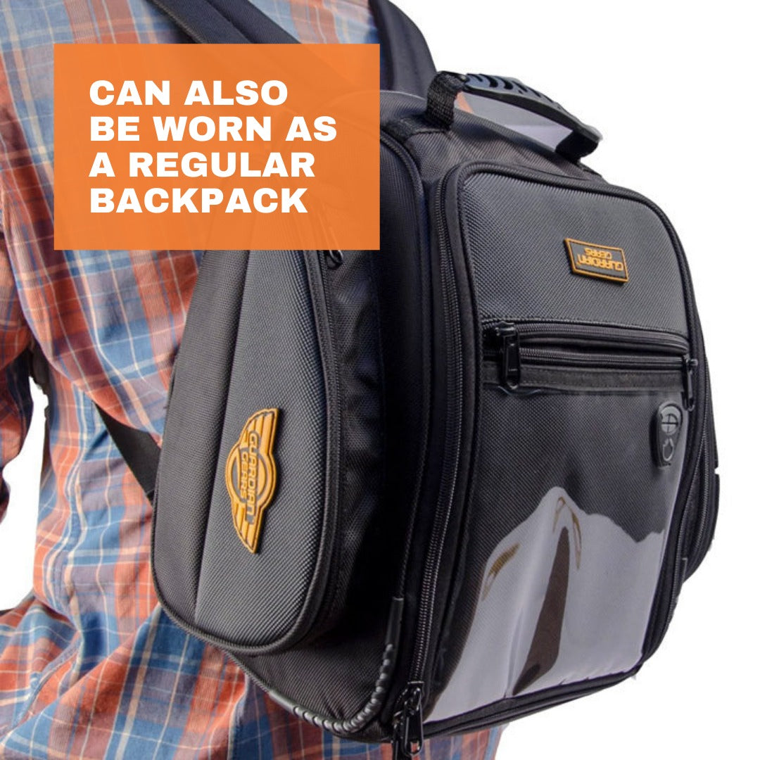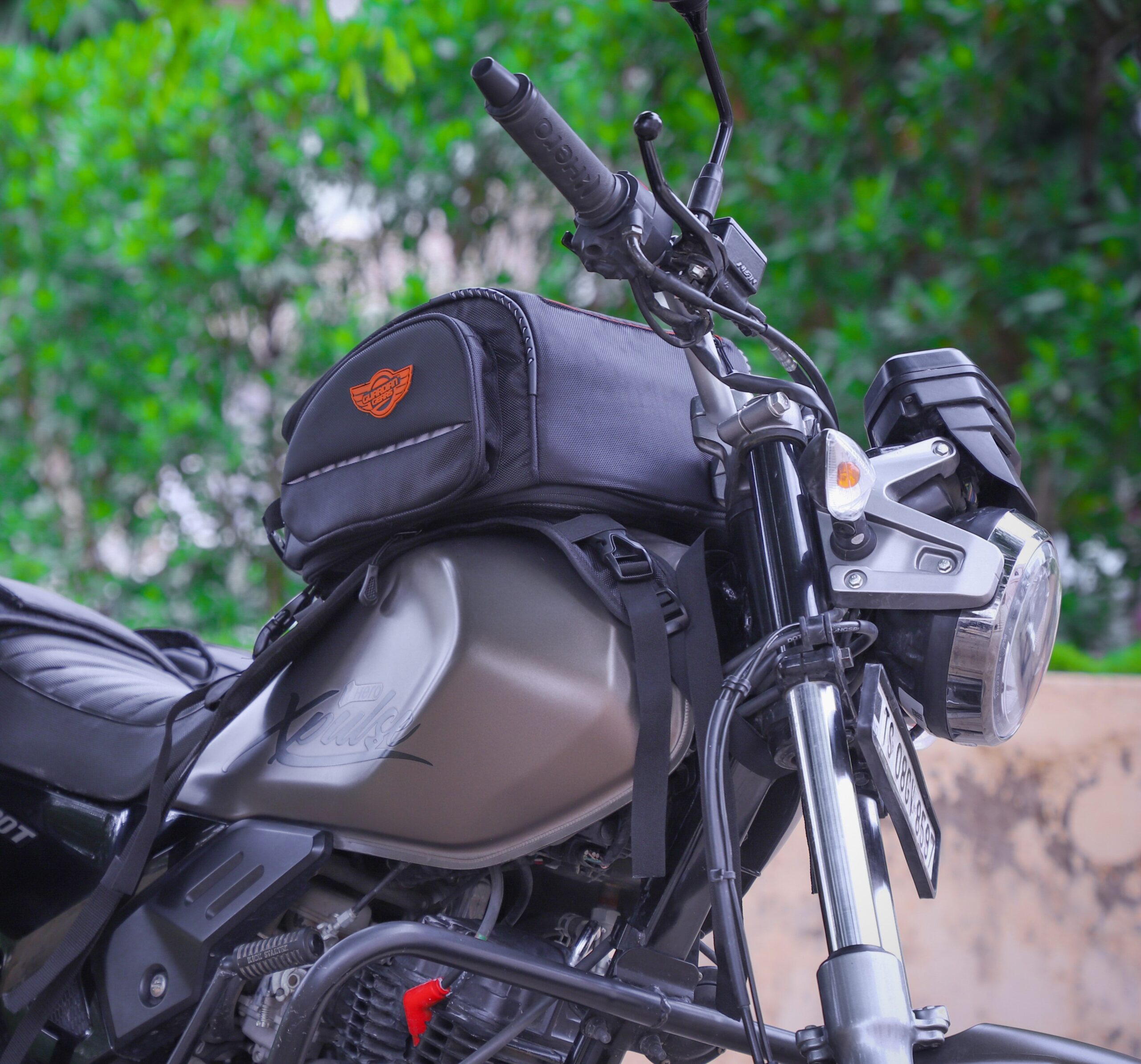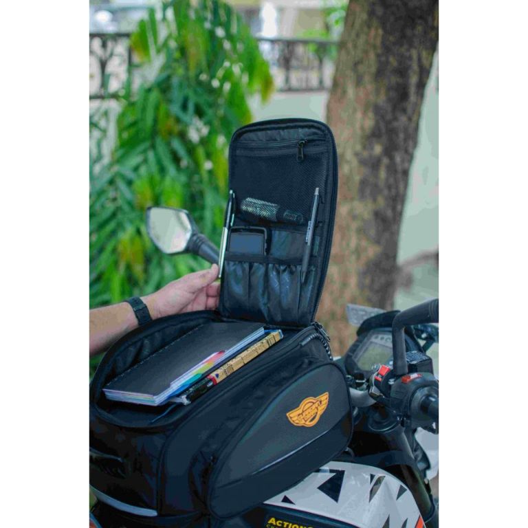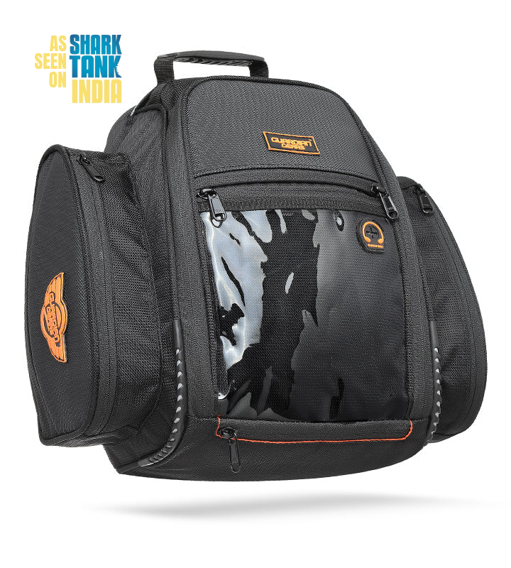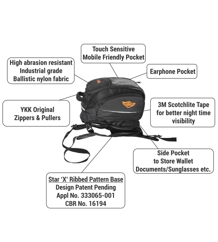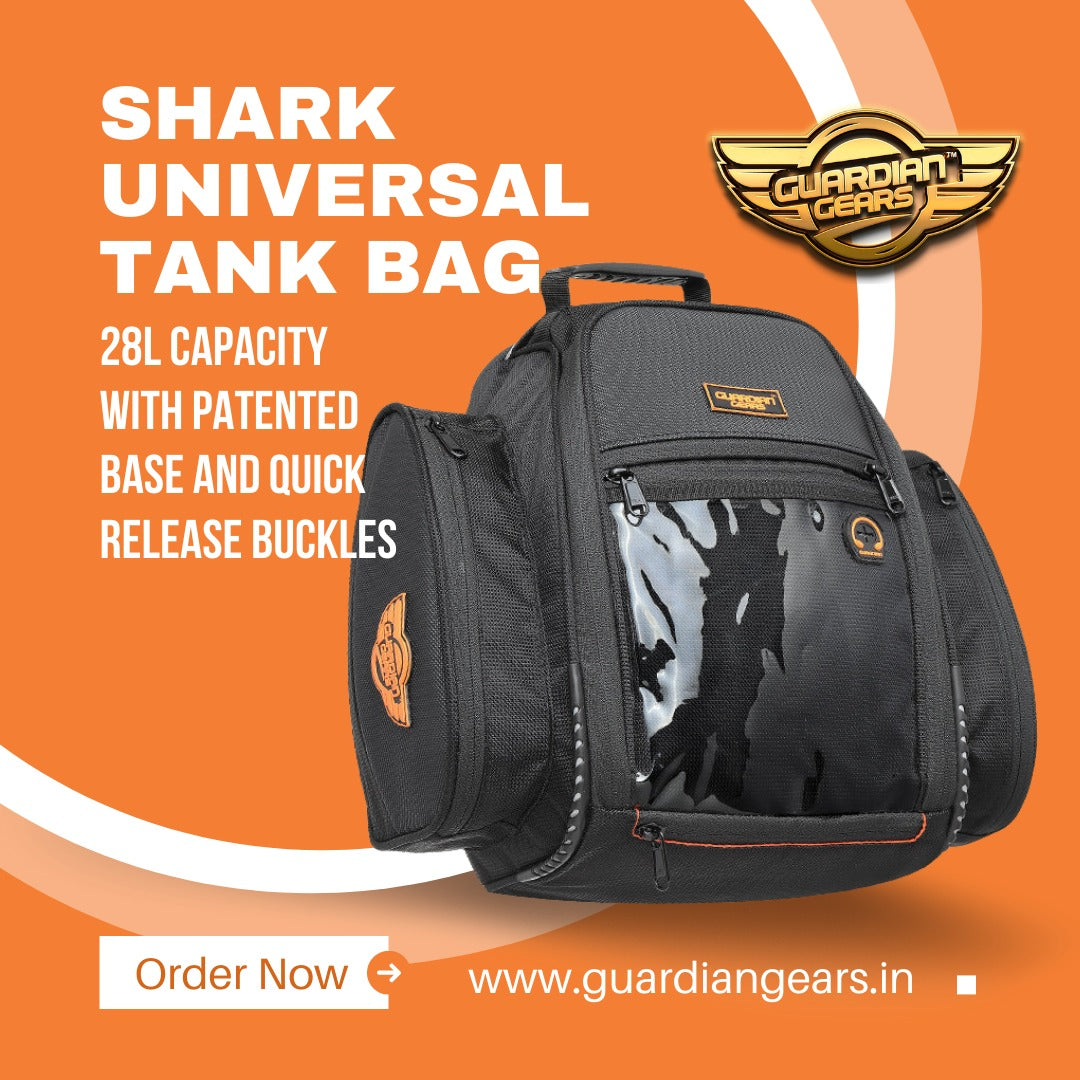 Guardian Gears Shark Universal 28L Tank Bag, suitable for ALL MOTORCYCLES (with FUEL CAP in CENTER) Metal or Fiber Tank. Made from 1680D High Abrasion Resistant Industrial Grade Ballistic Nylon Fabric, Heavy Duty Fitting, High Tensile straps, Original YKK Zippers and YKK Pullers and 3M Scotchlite Reflective strip, for durability, rugged use and long life. Unique Quick Release Design makes is very easy for mounting the tank bag On and OFF the motorbike. One time installation of Base (which also protects your tank from scratches) required and after that just click In and Out without the hassle of managing the hanging straps as the Base will remain on the Motorcycle, unlike what is available in the market today? If you have multiple Motorcycles then you may buy Extra Base (available separately) and use the tank bag on whichever motorbike you use for the day. Comes with a Rubberized Rain Proof Cover for protection from rains. Capacity of this tank bag is 21ltrs Expandable to 28ltrs, for carrying quick access items, documents, snacks, DSLR Camera, Camera accessories, small tiffin box and special Mobile Friendly Smart Phone Touch Sensitive pocket for ease of Navigation. Perfect companion for Daily Use, Day rides, Short Trips, Touring and Long Rides. One year Warranty on ANY MANUFACTURING DEFECT. Proudly MADE in INDIA.