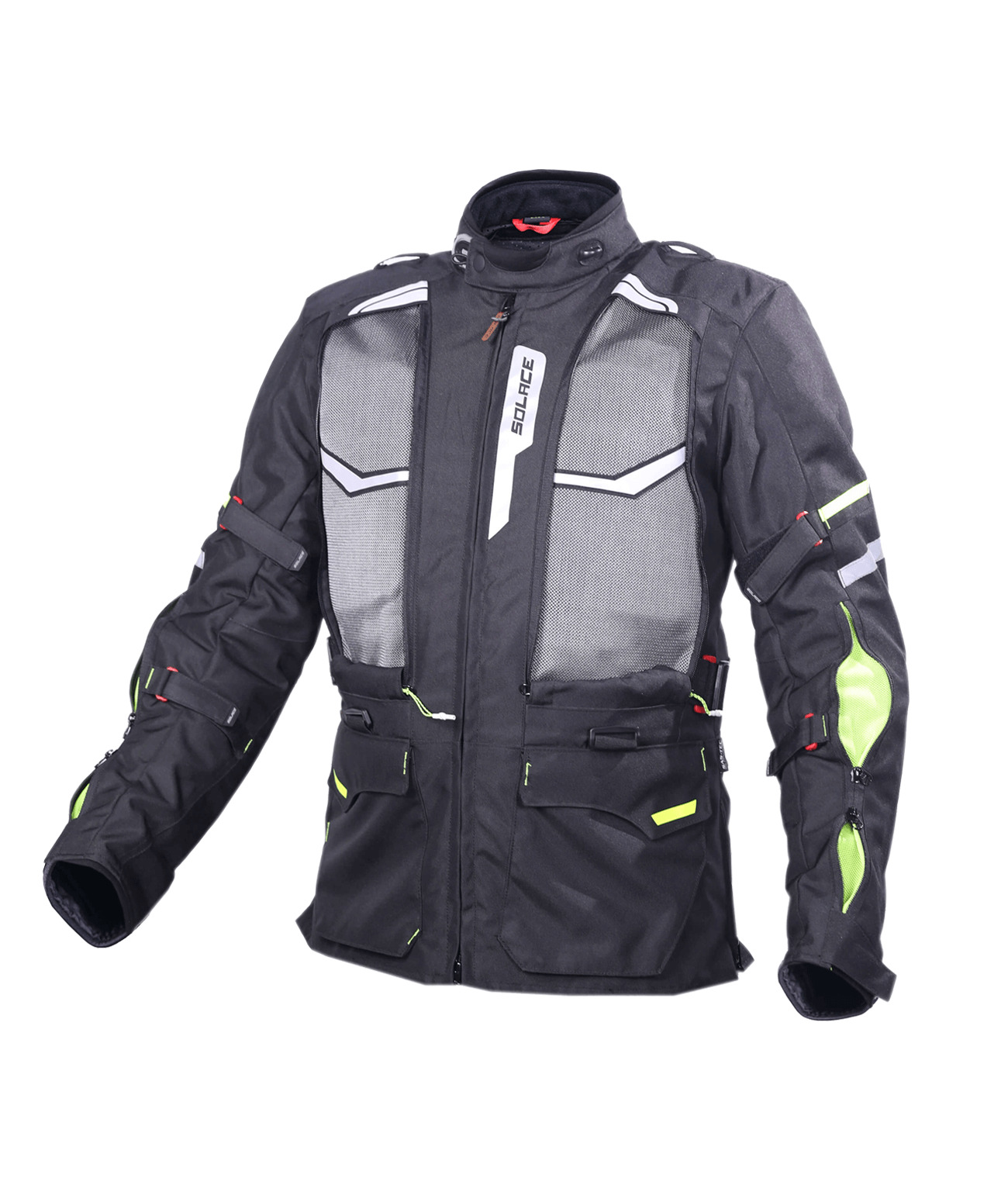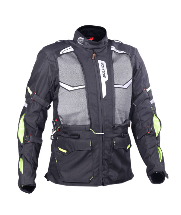 • Arms> Long length twin-zipper, 3D neon mesh backed vents on sleeves